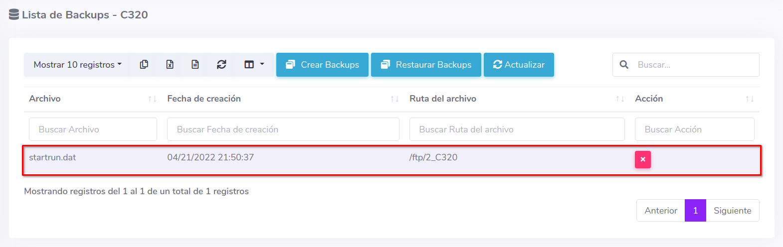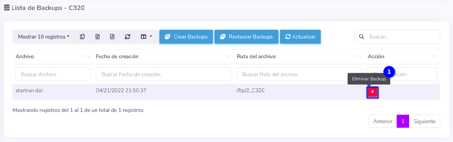 De click al botón con el símbolo X perteneciente al respaldo que desea eliminar