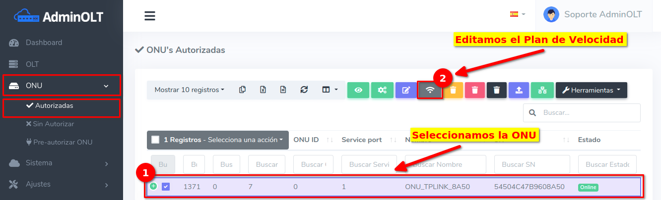 Para este ejemplo usaremos una ONU Autorizada que inicialmente tiene un Plan de 100 Megas, en este caso nosotros lo cambiaremos a un Plan de 25 Megas.