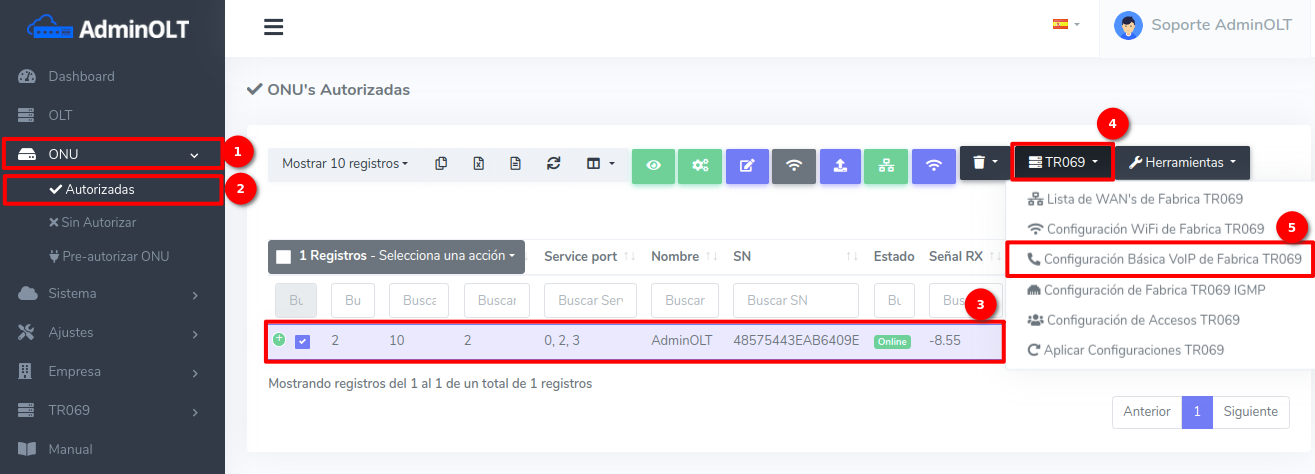 1Para poder agregar la configuración básica VOIP TR069, debemos dirigirnos a la sección ONU > Autorizadas. Seleccionamos la ONU a la que vamos a agregar la WAN IP, damos Clic en TR069 > Configuración Básica VoIP de Fabrica TR069.