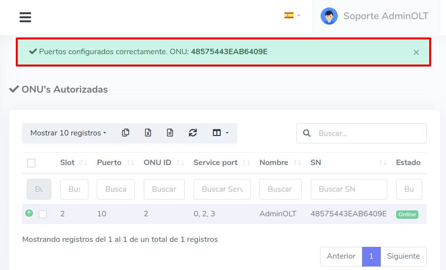 Es importante mencionar que esta información solo será guardada en AdminOLT y no se creará directamente en la ONU, para esto debemos de Aplicar Configuraciones de Fabrica TR069