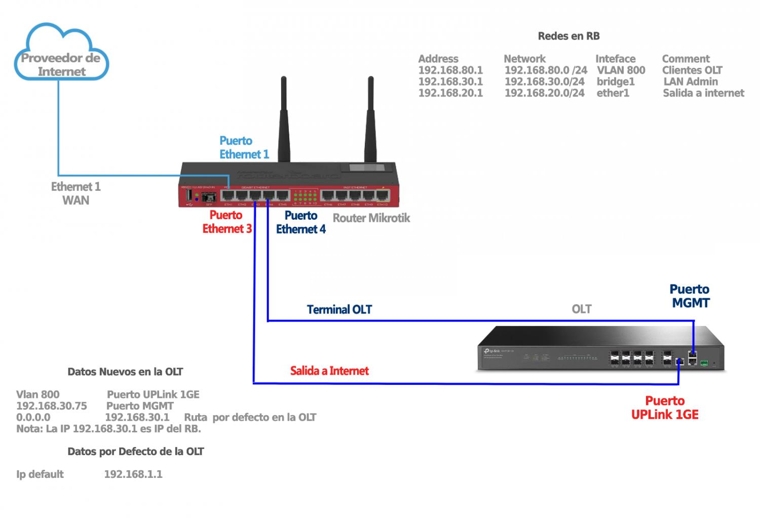 Para tener más clara como se estructura la conexión de la OLT al momento de realizar la configuración, puede apoyarse del siguiente diagrama, sobre como realizar la conexión física.