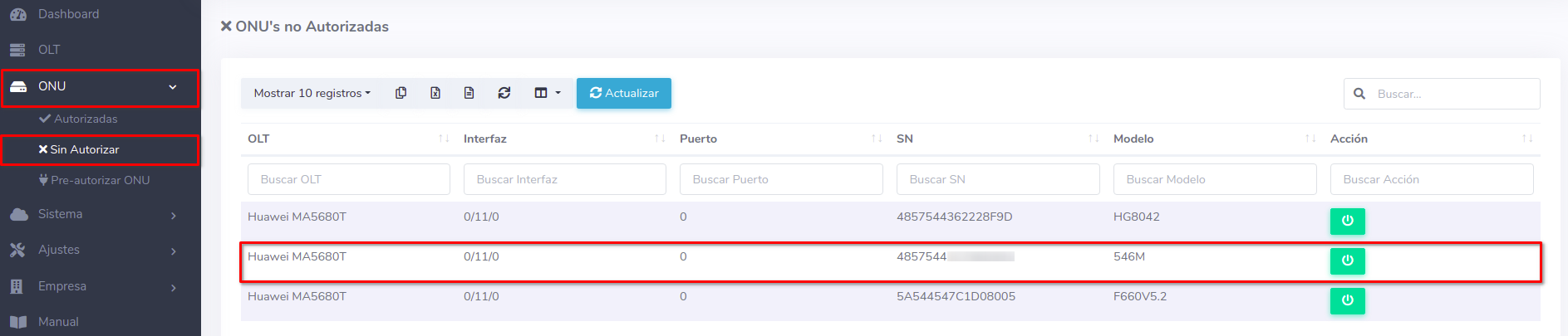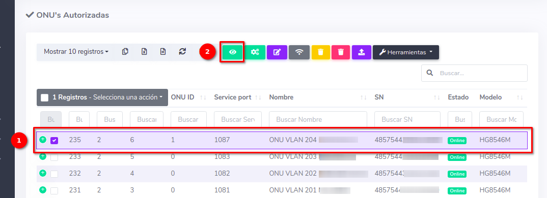 1Dirijase a la sección de ONU > Autorizadas y seleccione la ONU con la que desea trabajar.