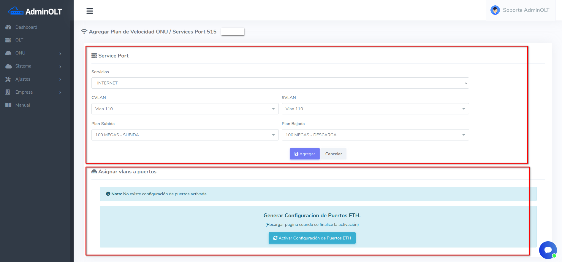 2 Dar clic en Agregar Plan de velocidad/Service Port.