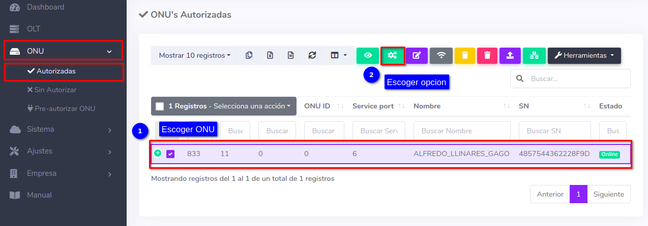 En AdminOLT podemos editar información de una ONU Autorizada en la OLT, supongamos que alguna de las ONUs que tenemos autorizadas en el sistema se estropea. Tomaremos como ejemplo esta situacion para explicar el propósito de esta función. Asi que en ese caso en AdminOLT al editar ONU por SN podemos tomar información de alguna ONU no Autorizada y usarla, sin perder la configuración inicial que teníamos.