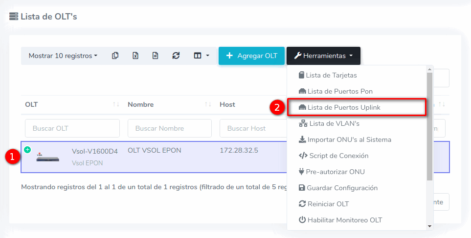 1En la Lista OLT's seleccionamos el equipo con el que trabajaremos para después ir a Puertos Uplink, que se encuentra en el botón con la leyenda Herramientas.