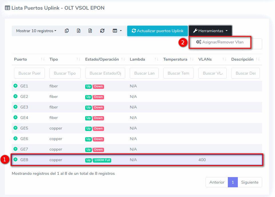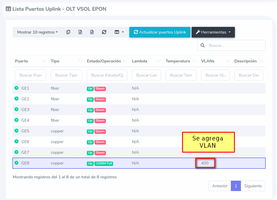Habilitar puerto UPlink Vsol EPON
