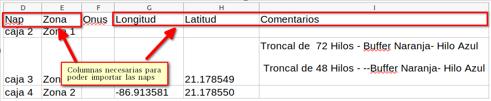Esta opción permite importar Naps desde un archivo CSV (Valores separados por comas) con las siguientes columnas.