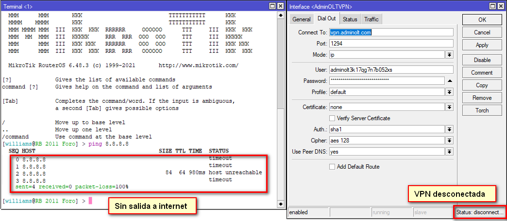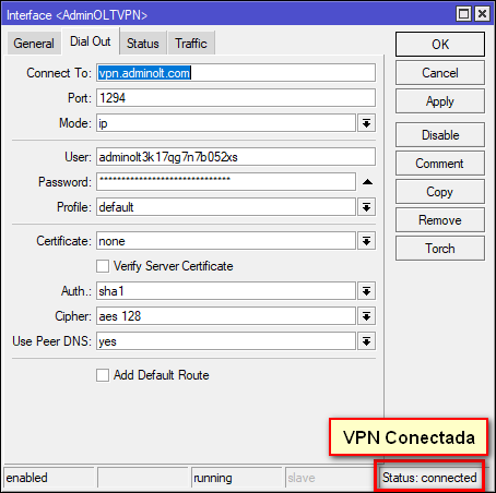 Cuando su OLT este conectada a través de la VPN que le brinda el sistema debe validar el estado en el que se encuentra, si usted ha perdido conexión y la VPN dice disconnect, debe validar que tenga salida a internet.