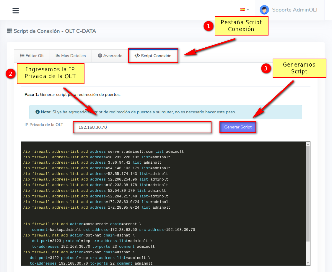 2 Nos dirigimos en la pestaña "Script Conexión", aquí ingresaremos nuestra ip privada y seleccionamos la opción Generar Script. A continuación veremos que se nos proporciona un Script.