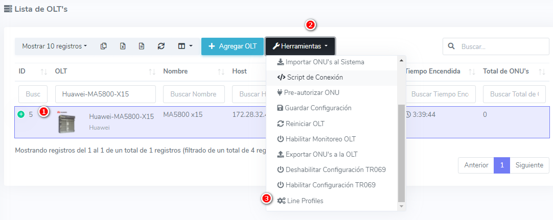 Vamos a Lista de OLT, en la barra de Herramientas seleccionamos la opción Line Profile