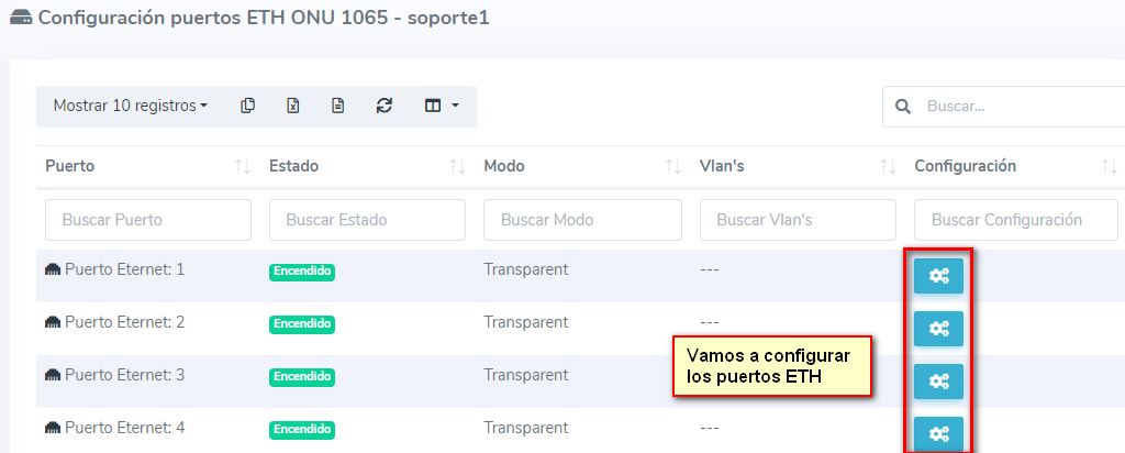 Como primer punto, seleccionamos la onu que autorizamos y vamos a la opción de configurar puertos ETH