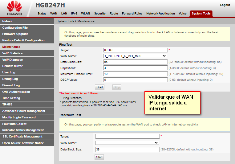 Combrobamos que tengamos internet con el WAN IP.