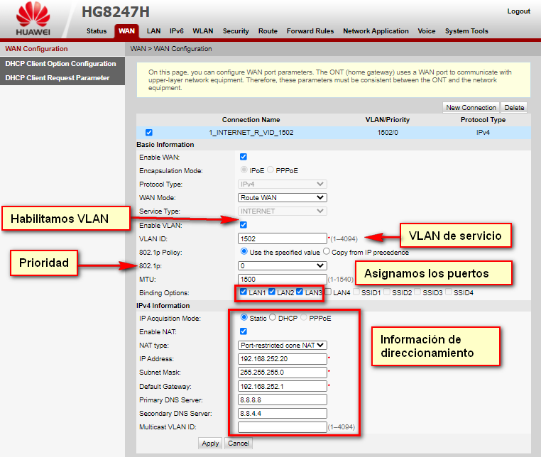 Para la creación de la WAN IP de IPTV usaremos la siguiente información
